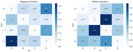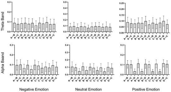 For the analysis of the transition probabilities, paired t-tests were conducted, and the results are presented in Table 3. Figure 6 shows the transition probabilities for negative, neutral, and positive emotions in both the theta and alpha bands. Significant differences were observed for both bands. In particular, in the theta band, both negative and positive emotions exhibited higher transition probabilities from B to D compared to neutral emotion (p = 0.037, effect size = −0.346, and p = 0.001, effect size = −0.562, respectively). More significant differences were observed in the alpha bands. Negative emotions displayed higher transition probabilities from A to D (p = 0.037, effect size = −0.354) and from D to A (p = 0.037, effect size = −0.513) than neutral emotions. In contrast, positive emotions showed lower transition probabilities from B to C (p = 0.037, effect size = 0.536) and from C to B (p = 0.037, effect size = 0.530) than neutral emotions. And it had a higher transition probability from D to C (p = 0.037, effect size = −0.328). The results of the paired t-test for the alpha band are shown in Figure 7.