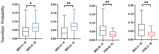 Dynamic microstate transition probability pairs. The ends of the box plot represent the maximum and minimum values. * indicate p < 0.05, ** indicate p < 0.01. NEG, negative emotion; NEU, neutral emotion; POS, positive emotion. See Table 3 for more detailed statistical information.