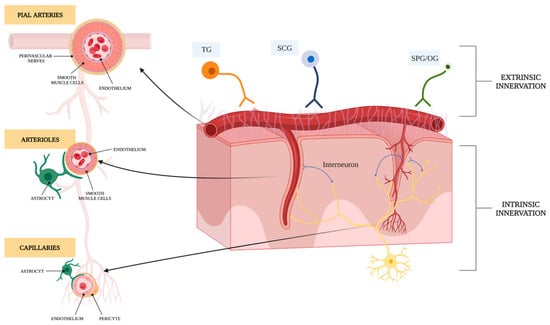 Cerebral vessels are controlled by two distinct types of innervation, classified as “extrinsic” or “intrinsic” and based on the vessel’s position (Figure 1). Indeed, the parenchymal arterioles and cortical microvessels receive innervation from neurons within the brain tissue—such as dorsal raphe nucleus, locus coeruleus and fastigial nucleus (i.e., by an “intrinsic” innervation), while the pial arteries and arterioles up to the Virchow–Robin space are innervated by the peripheral nervous system (i.e., by an “extrinsic” innervation). This latter comprises sensory nerves (from the trigeminal ganglion), parasympathetic nerves (from the otic and sphenopalatine ganglia) and a sympathetic innervation (from the cervical ganglia) [13,14].