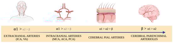 Starting from the major extra-cranial arteries, there is a decrease in the responsiveness to α-adrenergic receptors, accompanied by a gradual transition to β-adrenoceptors, moving toward the intracranial arteries and the small pial arterioles, eventually becoming nearly absent in parenchymal arterioles [42] (Figure 3).