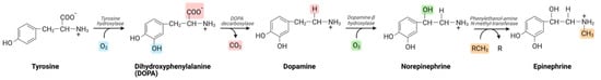 Catecholamines (Dopamine, Norepinephrine, Epinephrine) are organic compounds derived from tyrosine, consisting of a benzene ring with two hydroxyl side groups adjacent to each other and a side-chain amine. Dopamine is a natural catecholamine, the first in the catecholamine synthetic pathway (see Figure 4), an immediate precursor to norepinephrine and an endogenous central neurotransmitter.