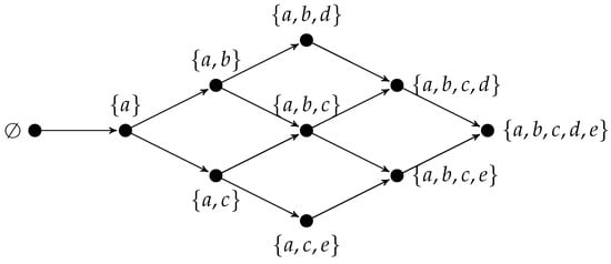 Figure 1 shows the Hasse diagram of . In the diagram, each node represents a knowledge state, and an arrow from a left node to a right node indicates that the state on the left is a subset of the state to the right.