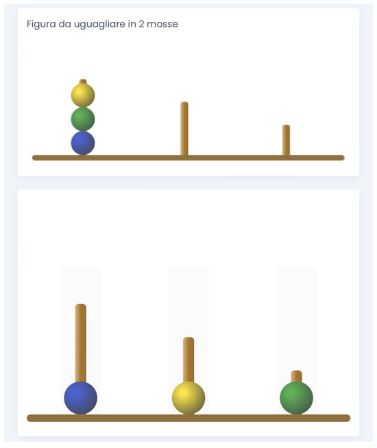 One of the items included in Adap-ToL. The stimulus is composed of two images. The one in the upper part is the goal state and the one in the lower part is the initial configuration. The initial configuration is used by the test-taker for making the moves. The text in Italian “Figura da uguagliare in due mosse” on the left top corner of the figure means “Figure to be matched in two moves”.