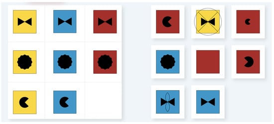 As in traditional tests that use Raven-like matrices as stimuli, the MatriKS task aims to identify the piece that best completes a visuospatial matrix among the proposed options. Response options in MatriKS can be five or eight, depending on the matrix type. The incorrect options, referred to as “distractors”, were intentionally crafted to replicate the same types of errors observed in traditional Raven’s Matrices []. These errors are classified into the following four categories: