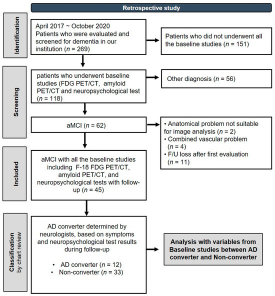 The present study was conducted retrospectively, spanning from April 2017 to October 2020. During this period, a total of 269 patients from the community and local dementia clinics were evaluated and screened for dementia at our center. Among these patients, we only enrolled those who had amnestic mild cognitive impairment (aMCI) and who underwent all the baseline studies, including F-18 FDG PET/computerized tomography [CT], amyloid PET/CT, and neuropsychological tests. Figure 1 is a flow diagram depicting the study design. The diagnosis of aMCI was established by a neurologist during the patient’s initial visit, based on clinical symptoms and the results from the Seoul Neuropsychological Screening Battery (SNSB) [19]. Petersen’s criteria [20] was used for the diagnosis of aMCI, with a requisite z-score of less than −1.5 in the memory domain, adjusted for age, education, and gender norms. At the time of aMCI diagnosis, the clinician was not informed of the amyloid PET scan results. We excluded individuals who did not follow up or had cerebrovascular disease or space-occupying lesions in the brain. In total, 45 patients with aMCI were included in the final analysis. After follow-up, our team of neurologists (HWK and JYJ) determined AD conversion and non-conversion based on the patient’s symptoms and neuropsychological test results. For the purpose of identifying AD converters, the diagnosis was determined based on the National Institute on Aging and the Alzheimer’s Association (NIA-AA) criteria [21,22]. At the time of evaluating AD conversion, the assessors were aware of the amyloid PET information.