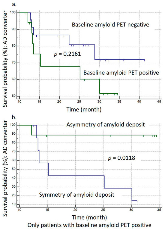 We conducted two Kaplan-Meier survival analyses (K-M analysis), defining ‘event’ as the occurrence of AD conversion. Figure 4a shows the results. The first analysis was conducted with amyloid PET-positive and negative patients. It appears that amyloid PET-positive patients have different conversion timings compared to the PET-negative group. This is evident from the mean survival times: 26.714 months for PET-positive and 35.344 months for PET-negative groups. However, the Logrank test for comparing survival curves shows a p-value of 0.2162, which suggests that the difference between the two groups is not statistically significant at conventional levels (p = 0.2162).
