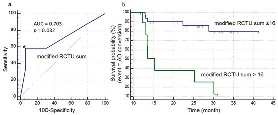 ROC Analysis and Survival Probability using Conventional and Modified RCTU Sum Scores. Panel (a) displays the Receiver Operating Characteristic (ROC) analysis of the modified RCTU sum scores. With a cut-off value of 16 (* in the graph), the ROC curve (blue line) indicates a sensitivity of 58.3%, specificity of 93.9%, and an Area Under Curve (AUC) of 0.703 (p = 0.032) for predicting Alzheimer’s Disease (AD) conversion from Amnestic Mild Cognitive Impairment (aMCI). Panel (b) shows the survival probability based on K-M analysis, divided by the modified RCTU sum score cut-off of 16. The graph represents the comparison of survival probabilities (or the risk of AD conversion) between patients with RCTU sum scores equal to or less than 16 (blue line) and those with scores greater than 16 (green line).