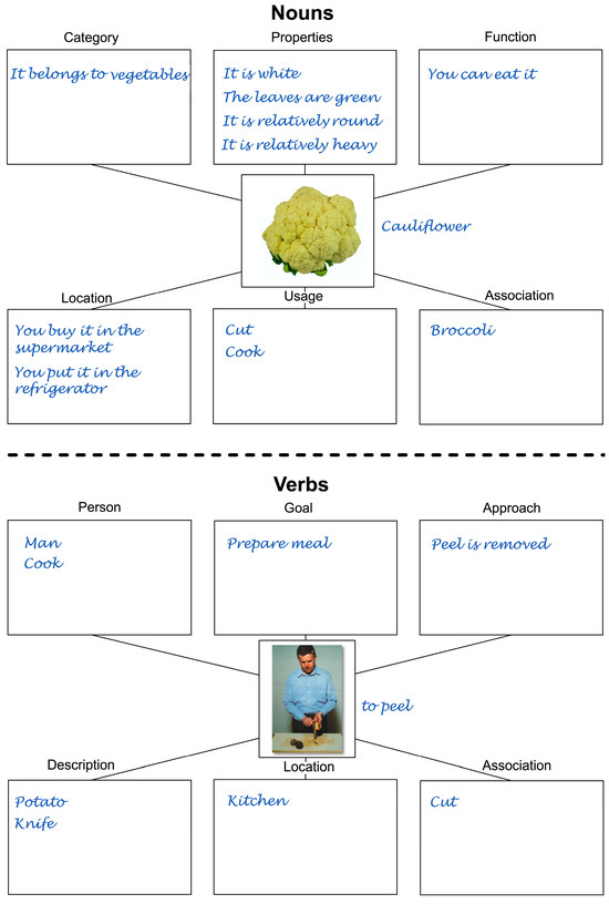 SFA sheets for nouns and verbs. (top): SFA sheet for nouns for the word “Blumenkohl” (cauliflower) as an example. (bottom): SFA sheet for verbs for the word “schälen” (to peel) as an example. The participant’s original responses were translated into English.