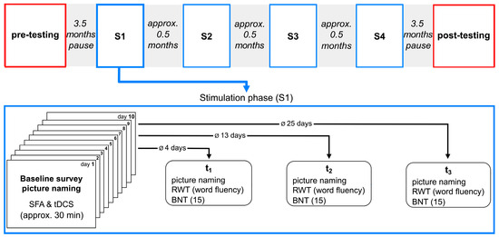 A diagnostic pre-testing was performed prior to the therapeutic intervention (Figure 3). Further, at the beginning of each stimulation phase (S1–S4), a baseline survey took place in which the participant was asked to name 40 nouns and 40 verbs shown in the form of picture cards. Afterward, SFA training and concurrent tDCS started.