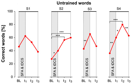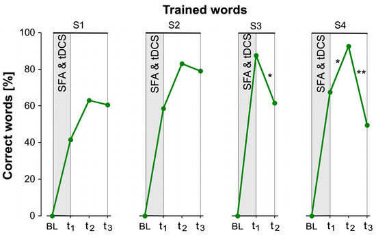 Another aspect addresses the question of which of the respective test time points within a stimulation phase were predictors for the correct or incorrect naming of items in the other test time points. For this purpose, binomial logistic regression was performed for each test time point separately for trained and untrained words. The results for trained items indicate that the ability to retrieve trained words actually increased until two weeks after the end of stimulation (Figure 4). In S4, this was significant (B = 1.705, SE = 0.856, Z = 1.99, p = 0.05). In S3, naming performance already decreased significantly between t1 and t2 (B = −1.455, SE = 0.752, Z = −1.94, p = 0.05). In S4, it decreased significantly only between t2 and t3 (approximately 2–4 weeks after the intervention) (B = −2.398, SE = 0.844, Z = −2.84, p = 0.004). Figure 4 shows the percentage of correctly named trained words for all stimulation phases and intermediate tests. In the baseline (BL), none of the subsequently trained words could be retrieved. The percentage of correctly named words increased by approximately 20% from t1 to t2 in all stimulation phases except S3.