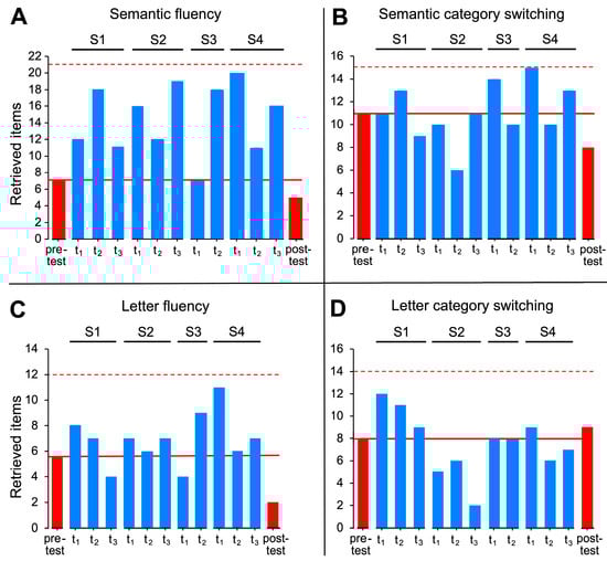 Results for word fluency. The absolute number of words retrieved in the semantic fluency, letter fluency tasks, semantic category switching, and letter switching tasks are shown separately for the pre-and post-testing (red columns) and the intermediate tests at t1, t2, and t3 of all stimulation phases (blue columns). The dashed red line represents age-appropriate norms, the solid red line represents the value collected in pre-testing.