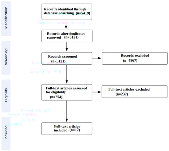 Figure 1 depicts the screening process as a flow chart. Initially, 5419 records underwent screening, with 5121 being excluded based on the evaluation of their titles and abstracts, primarily due to their topic relevance. Through the search strategies carried out in the database, 254 studies were identified. Of these, 237 studies were excluded on the grounds of their publication type. After a thorough examination of the study abstracts and full texts, 17 articles were considered suitable for inclusion.
