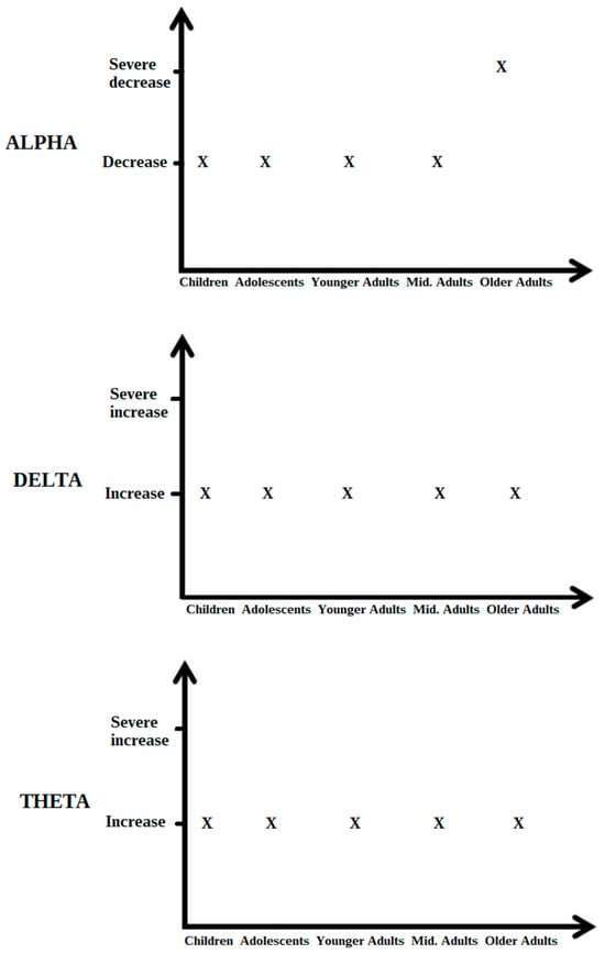 Furthermore, longitudinal studies have provided insights into the evolution of EEG patterns with age in DS patients. With advancing age, individuals with DS commonly exhibit a decline in alpha activity, particularly noticeable in posterior brain regions. This age-related decline in alpha activity might correlate with cognitive decline and neuropathological changes characteristic of aging in DS. These findings emphasise the importance of understanding the neural dynamics across the lifespan of individuals with DS to provide targeted interventions for cognitive support and enhancement Figure 2 shows changes in EEG alpha, theta, and delta activity across different age groups in people with DS.