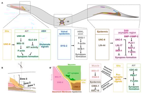 In C. elegans, CED-10/Rac1, MIG-10/Lamellipodin, CDC-42/CDC42, and PES-7/IQGAP are specifically localized to the AIY Zone 2 regions in response to extracellular signals mainly from VCSC glia, where they promote local presynaptic assembly [95,96]. Ectopic CDC-42 or PES-7 localization in the zone 1 region results in the ectopic presynaptic assembly (Figure 1B’) [95].