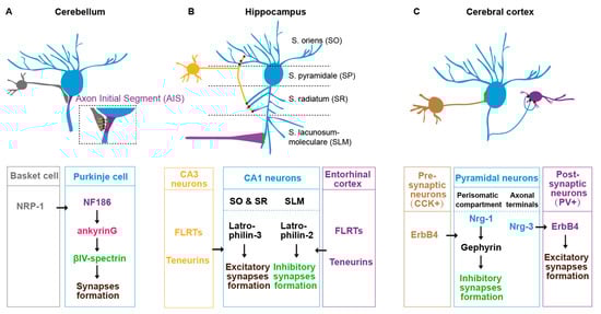 Figure 2. Postsynaptic subcellular specificity in mouse brain. (A) The synaptic subcellular specificity between basket cells (grey) and Purkinje cells (blue) axon initial segment (AIS) in mouse cerebellum. (B) The synaptic subcellular specificity of the CA1 pyramidal neurons (blue) in mouse hippocampus. The dendrites in the S. oriens (SO) and S. radiatum (SR) regions receive synaptic inputs from CA3 pyramidal neurons (yellow), whereas the dendrites in S. lacunosum-moleculare (SLM) receive synaptic inputs from entorhinal cortex (purple). (C) The synaptic subcellular specificity of pyramidal neurons (blue) in the cerebral cortex. Neuregulin (Nrg)1 and Nrg3 in pyramidal neurons are sorted into perisomatic and axonic domains, which are required for synaptic targeting from CCK neurons (brown) and to PV neurons (purple).
