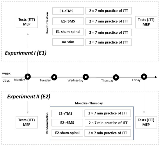 Only in E1 was a group of subjects tested and trained in JTT without any stimulation. In E2, the test and motor training procedure were the same as for the rTMS, rSMS, and sham-spinal group in E1.