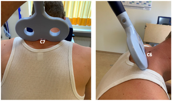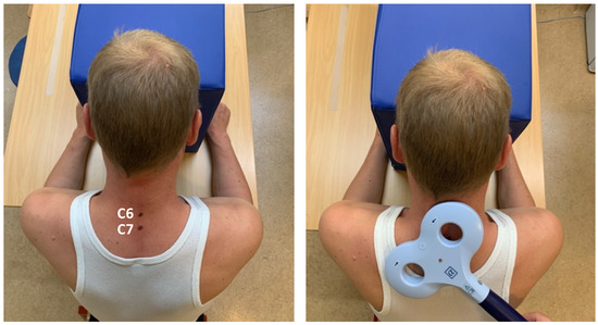 According to a recent study, the amplitude of the soleus Hoffmann’s Reflex was influenced by the coil position at TH8 and below but not by the MEP [16]. For the rSMS, we chose to position the coil in E1 and E2, as it is used in routine measurements to determine central motor conduction time. Therefore, the spinous process of the seventh cervical vertebra (C7) was identified as the main landmark of the skeleton. The coil’s center was positioned below C7 and turned 45° to the left to stimulate the left CST in its root over the anterior grey matter horn (Figure 2). The coil’s position was modified until a visible contraction of the hand and fingers resulted from the stimulation target. The coil used for rTMS was also used for rSMS. The stimulation protocol for rSMS was indistinguishable from that for rTMS.