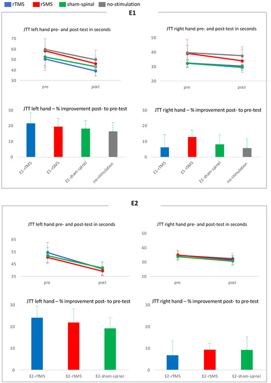 Table 1. Mean time pre- and post-test in seconds (s) for the JTT with the left hand with standard deviations (E1). The time decrease from post-test to pre-test was calculated as an increase in %JTT left hand (with standard deviations). The mean %JTT of the left hand of the E1-rTMS group increased the most with 21.6 ± 6.7%, then E1-rSMS with 19.5 ± 5.1%, followed by the E1-sham-spinal group with 18.2 ± 5.1%, and finally the no-stimulation group with 16.3 ± 5.8%.