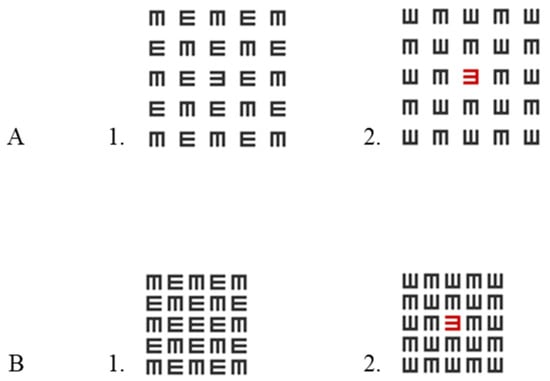 The sitting distance was fixed at 185 cm. We measured the luminance intensity of the stimulus (E letter-isolated/crowding) and the background (a white screen) using a luminance meter (LS-100 KONICA MINOLTA, Tokyo, Japan). The luminance of both the black and red of the target letter and matrix was 9.5 cd/m2; it was presented on 65 cd/m2 of a white screen. The Weber contrasts were 85%. All stimuli were displayed binocularly. There was a matrix of E letters around the E target letter (black or red), which was arranged randomly. The size of the matrix was 5 × 5 letters. The size of each matrix letter corresponded to the size of the target letter. The target letter was an E letter presented at the center of the screen (presented on the central fovea), and it was marked by a fixation point. The letter E was displayed at a size of 2.7 mm, corresponding to a visual acuity of 20/20 (i.e., the stroke width was 1 arcminute, and the overall size of the letter was 5 arcminutes). The target letter was shown either in black or red. The task of the participants was to indicate the direction of the E target by clicking on the mouse key by using two different fingers (right click for E or left click for ꓱ); counterbalancing across participants was not performed because, in our opinion, this is the intuitive way. The side of the button corresponded to the side to which the signal was directed. In our further research, we did not find a significant difference between a black matrix with a red target letter and a red matrix with a black target letter, so we chose to present only the first condition [46]. There were four conditions (in random order [mixed by trials]): two for uncrowded (1-letter spacing between letters and a total size of 35 arcminutes) conditions (black, red) and two for crowded (0.4-letter spacing between letters and a total size of 23 arcminutes) conditions (black, red; in the middle of a black matrix) (see Figure 1). Note that the 0.4-letter spacing represents 0.4 times the letter size when the spacing is measured from edge to edge. Our ‘uncrowded’ definition relies on a previous article [48], and the spacing was carried out according to the methodology of visual acuity testing using the ETDRS chart where there is a space of one letter between letters to avoid crowding. Unlike in our previous article [31], here, we presented a spaced matrix (1-letter spacing) instead of a single letter to maintain a similar energy level (for ERP waves) for a smaller matrix (0.4-letter spacing).