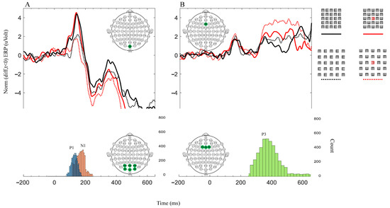 Each graph represents a different brain area denoted by a green electrode in the EEG inserted montage. Graph (A) represents the occipital electrodes (PO3, POZ, PO4, O1, OZ, and O2), and graph (B) represents the frontal electrodes (F1, FZ, and F2). The upper graphs represent the average (n = 9) ERP data for the correct response results. Each color and line type of the four lines represent a different matrix (on the upper right side of the graphs). The solid black line denotes BC, and the solid red line denotes RC. The dotted black line denotes BUC, and the dotted red line denotes RUC. The bottom graphs correspond to all conditions and represent the distribution of the count (the number of peaks) for the three components, namely P1 (blue), N1 (orange), and P3 (green), to ensure that the upper ERP graph faithfully represents the main components. The time windows are 50–200 ms for P1, 150–250 ms for N1, and 250–650 ms for P3. The y-axis represents the baseline corrected to the mean value of −200 ms, which precedes the stimulus onset data points.