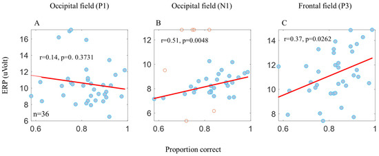 Pearson’s correlation between behavior and the ERP components. No significant correlation was found between the proportion correct and the P1 amplitude (A). A significant correlation was found between the proportion correct, the N1 amplitude (B), and the P3 amplitude (C). The N1 and P1 components of the occipital electrodes (the PO3, POZ, PO4, O1, OZ, and O2 electrodes) and the P3 component of the frontal electrodes (the F1, FZ, and F2 electrodes). The blue dots in the graph represent the participant’s average data (n = 9) from the 4 conditions (n = 36). The correlation only applies to the blue dots. The red dots represent the outlier data according to Pearson’s correlation formula.