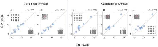 Global (refers to the average of all electrodes (64 electrodes)) field power (N1) between BC and BUC (A) and between BC and RC (B). Occipital field power (N1) between BC and BUC (C), between BC and RC (D), and between BUC and RC (E). The dots in the graph represent the participant’s average data (n = 9). Each dot in the graphs represents the average of the runs of each participant under two conditions indicated in each graph and separated by a diagonal line. The p value represents a statistical paired t-test.