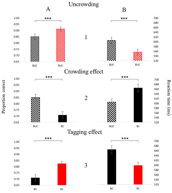 Psychophysics results: the proportion correct (A) and the reaction time (B) for the uncrowded (1), crowded (2), and tagging (3) effects. Comparisons between two conditions for each of the graphs (the proportion correct and the reaction time) are significant. The bars represent the mean across participants with SE (standard error) bars. Three asterisks represent p < 0.001.