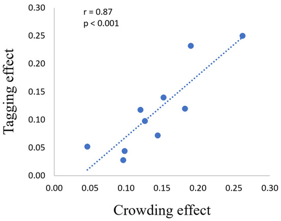 To understand whether a relationship exists between crowding and the tagging mechanism, we correlated the percentage of crowding reduction with the percentage of tagging improvement (Figure 6). Importantly, we found a significant correlation between them (r = 0.87, p < 0.001).