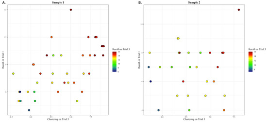 The spontaneous production of a semantic clustering strategy during encoding is associated with better learning (i.e., Trial 1 Recall and Trial 5 Semantic Clustering predict Trial 5 Recall). (A) In sample 1, individuals who scored higher on both Trial 1 encoding and Trial 5 semantic clustering strategy production had the highest Trial 5 Recall (variance in Trial 5 recall predicted by the independent variables was R2 = 0.53, p < 0.01). (B) In sample 2, the results supported a similar finding; individuals who scored higher on Trial 1 encoding and Trial 5 semantic clustering had the highest Trial 5 Recall (R2 = 0.51, p < 0.01). Individuals with the highest level of Trial 5 Recall are shown in red, those with a medium level of Trial 5 Recall are shown in yellow and green, and those with the lowest level of Trial 5 Recall are shown in blue.