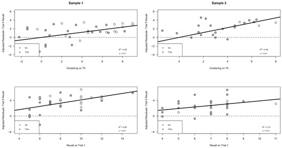 The spontaneous utilization of a semantic clustering strategy during retrieval is associated with better free short-delay free recall (i.e., Short-Delay recall semantic clustering and Trial 5 recall predict Short-Delay recall performance). This graph is a different depiction of the results in Figure 3, showing that better Trial 5 recall and greater short delay semantic clustering utilization each contributed independently to better short delay free recall. (Sample 1, top graph) The y axis displays the adjusted residual variance in short delay free recall after the variance due to recall on Trial 5 was removed; the scatterplot illustrates the relationship between the adjusted short delay recall and semantic clustering utilization in Sample 1. (Sample 1, bottom graph) The y axis displays the adjusted residual variance in short delay free recall after the variance due to semantic clustering score has been removed; the scatterplot illustrates the relationship between adjusted short delay recall and recall during the fifth encoding trial. (Sample 2, top graph) The y axis displays the residual variance in short delay free recall after the variance due to recall on Trial 5 was removed; the scatterplot illustrates the relationship between the adjusted short delay recall and semantic clustering utilization in Sample 2. (Sample 2, bottom graph) The y axis displays the residual variance in short delay free recall after the variance due to semantic clustering score has been removed; the scatterplot illustrates the relationship between adjusted short delay recall and recall during the 5th encoding trial. SA = Superagers, hollow circles; TOA = typical older adult, filled circles.