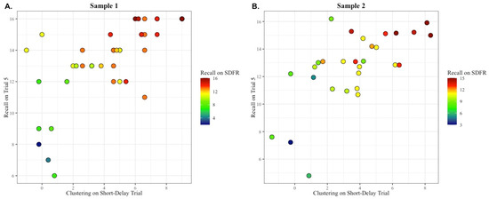 The spontaneous utilization of a semantic clustering strategy during retrieval is associated with better free recall (i.e., Short-Delay recall semantic clustering and Trial 5 recall predict Short-Delay recall performance). (A) In sample 1, individuals who scored higher on both Trial 5 recall and short-delay semantic clustering strategy utilization had the highest short-delay recall (variance in short-delay recall predicted by the independent variables was R2 = 0.81, p < 0.01). (B) In sample 2, the finding was again that high Trial 5 recall and short-delay clustering yielded high short delay free recall (R2 = 0.70, p < 0.01). Individuals with the highest level of short-delay free recall (SDFR) are shown in red, those with a medium level of SDFR are shown in yellow and green, and those with the lowest level of SDFR are shown in blue.