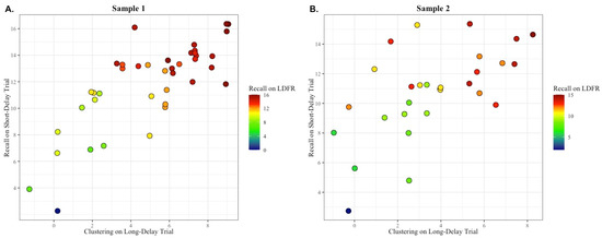 The spontaneous utilization of a semantic clustering strategy during retrieval is associated with better long-delay free recall (i.e., long-delay recall semantic clustering and short-delay recall predict long-delay recall performance). (A) In Sample 1, individuals who scored higher on both short-delay free recall and long-delay semantic clustering strategy utilization had the highest long-delay recall (variance in short-delay recall predicted by the independent variables was R2 = 0.83, p < 0.001). (B) In Sample 2, results suggested a similar finding, where individuals scoring higher on both short delay free recall and long delay semantic clustering utilization had high long-delay free recall (R2 = 0.77, p < 0.001). Individuals with the highest level of long-delay free recall (LDFR) are shown in red, those with a medium level of LDFR are shown in yellow and green, and those with the lowest level of LDFR are shown in blue.