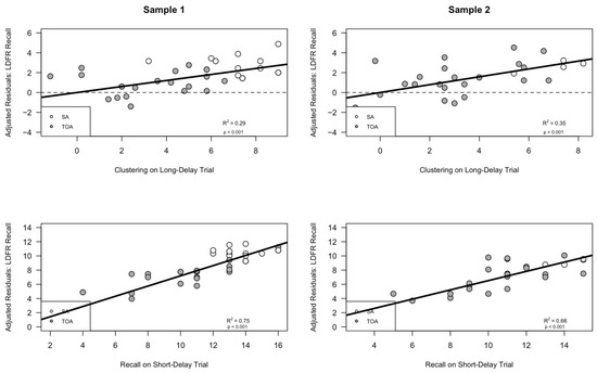 The spontaneous utilization of a semantic clustering strategy during retrieval is associated with better free long-delay free recall (i.e., long-delay recall semantic clustering and short-delay trial recall predict long-delay recall performance). This graph is a different depiction of the results in Figure 5, showing that better short-delay trial recall and greater long-delay semantic clustering utilization each contributed independently to better long delay free recall performance. (Sample 1, top graph) The y axis displays the adjusted residual variance in long delay free recall after the variance due to recall on the short-delay trial was removed; the scatterplot illustrates the relationship between the adjusted long delay recall and semantic clustering utilization in Sample 1. (Sample 1, bottom graph) The y axis displays the adjusted residual variance in long-delay free recall after the variance due to semantic clustering has been removed; the scatterplot illustrates the relationship between adjusted long delay recall and recall during the short-delay recall trial. (Sample 2, top graph) The y axis displays the residual variance in long delay free recall after the variance due to recall on the short-delay trial was removed; the scatterplot illustrates the relationship between the adjusted long-delay free recall performance and semantic clustering utilization in Sample 2. (Sample 2, bottom graph) The y axis displays the residual variance in short delay free recall after the variance due to semantic clustering score has been removed; the scatterplot illustrates the relationship between adjusted long-delay recall performance and recall during the short-delay trial. SA = Superagers, hollow circles; TOA = typical older adult, filled circles.