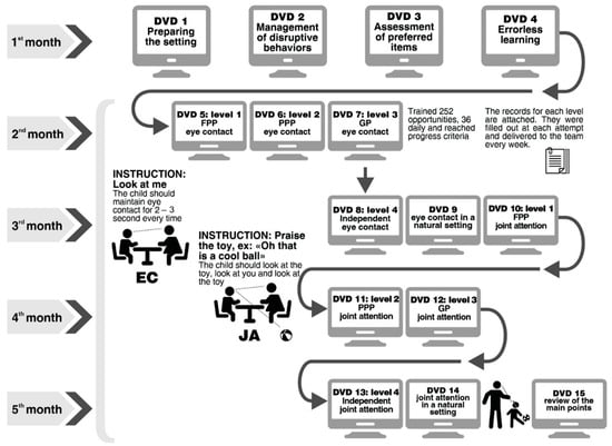 The remaining 10 videos contained a sequence of prompts to teach eye contact and joint attention; the last one was a review. At each session, the families received a copy of the video shown that day to practice at home. More details about video contents were described elsewhere [,].