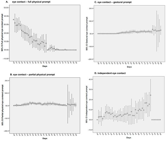 Figure 2 depicts the means of attempts (with 95% confidence intervals) across time (days) for the four outcomes: full physical prompt (FPP), partial physical prompt (PPP), gestural prompt (GP), and independent (I) in respect of eye contact. The number of attempts could vary from 0 (if the family did not apply the protocol on a given day) to 36 (the maximum number of attempts per day).