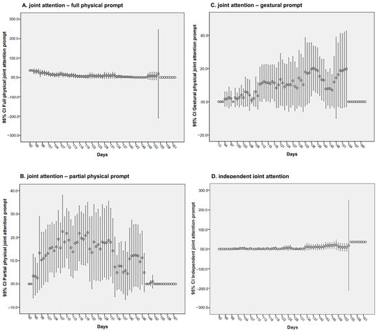 Figure 3 depicts the means of attempts (with 95% confidence intervals) across the intervention period (days) for the four outcomes regarding joint attention. The number of attempts could vary from 0 (if the family did not apply the protocol on a given day) to 36 (the maximum number of attempts per day).