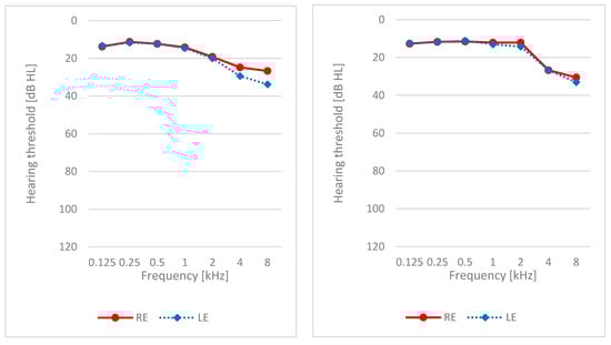 Average hearing thresholds across all frequencies (from 0.125 to 8 kHz) are shown in Figure 1. Average hearing thresholds were, for most frequencies, better than 20 dB HL, although they were slightly worse at higher frequencies, which is typical for age-related hearing loss. In the study group, there were 19 patients (79%) who had mean hearing thresholds better than 20 dB HL in the right ear and 16 (67%) who had mean hearing thresholds better than 20 dB HL in the left ear. In the control group, the figures were 18 (69%) and 17 (65%), respectively.
