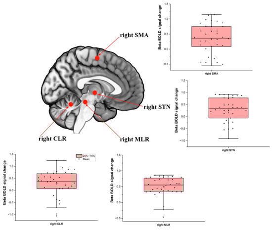 The 3.0 T MR system (Achieva, Philips Medical Imaging, The Netherlands, Amsterdam) with 32-channel head coil (80 mT/m gradient maximum amplitude) was used to obtain the images BOLD-sensitive images were acquired using T2*-weighted gradient echo-planar imaging (EPI): TR, 2.000 ms; TE, 30 ms; 40 slices; 3.0-mm slice thickness; 0.3-mm interslice gap; 3.0-mm3 isotropic voxels; 240 volumes (acquisition time, 8 min). Anatomical T1-weighted 3-D images were used for reference and image registration (T1-FFE; TR, 7 s; TE, 3.2 s; 180 slices; Flip angle, 8°; 1 mm3 isotropic voxels). fMRI data were processed using FSL software version 6.0 (www.fmrib.ox.ac.uk/fsl/, accessed on 30 April 2019) [48]. The volumes were preprocessed with an algorithm designed to reduce head movement (MCFLIRT), spatial smoothing (FWHM, 5 mm), [49] and images were affine registration to the standard space of MNI-152 (12 DoF) [50,51]. The level of head motion was less than 1 mm to avoid erroneous inference on neuronal function [30]. MCFLIRT is a motion correction tool based on FLIRT (FMRIB Linear Image Registration Tool), which is a fully automated robust, and accurate tool for linear (affine) intra- and inter-modal brain image registration used in FEAT (FMRI Expert Analysis Tool) from FSL. Further, the calculated motion parameters by the MCFLIRT tool during the pre-procedure were added in the statistic model as confounders/covariates, using the standard option, which considered only 6 parameters of motion correction (3 for translation and 3 for rotation) during the analysis, in addition to the task-related regressors [50,52]. The event of interest was the time from the onset of the first stimulus until 1 s after leg lifting onset, as detailed previously [24] and also included in the Supplementary File. A linear model was implemented to estimate the BOLD signal in the event of interest compared to resting periods. The beta of the BOLD signal change of regions of interest was extracted using the featquery tool processing routine from FSL. The peak coordinates of the regions of interest of the right hemisphere during step initiation were SMA: x = 3, y = −13, z = 61, radius = 8 mm [26]; subthalamic nucleus: x = −11, y = −14, z = −3, radius = 8 mm [17]; MLR: x = 6, y = −30, z = −19, radius = 6 mm [17]; cerebellar locomotor region: x = 7, y = −52, z = −16, radius = 6 mm [17], which are illustrated in Figure 1.