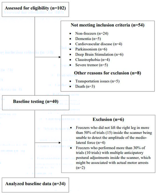 Forty freezers performed baseline testing (clinical, behavioral, PSI of the soleus muscle for step initiation, and an fMRI protocol for step initiation), with six of them being excluded from the analysis as detailed in Figure 2. The demographic, clinical, and behavioral variables, as well the values of PSI of the soleus muscle for step initiation and the beta of the BOLD signal change of regions of interest are presented in Table 1.