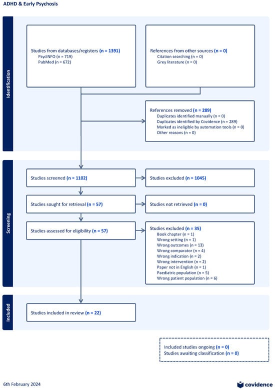 Following the SANRA guidelines, we completed a literature search on PubMed and PsycINFO. Search terms were created with the assistance of a librarian: (ADHD OR “attention deficit disorder” OR “attention deficit hyperactivity disorder”) AND (psychosis OR psychotic OR schizophrenia) AND (early OR “first episode”). The search was conducted between 27 September and 30 October 2023 and we included studies that had been published up to October 2023. The last search was conducted on 30 October 2023. We used Covidence to screen and extract studies that met our inclusion criteria, as listed below. For papers to be included in this review, they had to meet the following inclusion criteria: