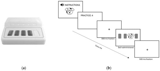 The stimuli were presented electronically using E-Prime 3.0 software []. A dog was chosen as the target. Each participant received visually supported verbal instructions for the task: “Hello, in this experiment we need your help to find a puppy, it can appear in one of these four positions, when you see it on the screen press the corresponding key on the keypad, you have to do it as fast as possible”. For the response, we utilized the USB response device Chronos [], employing four of the five horizontally positioned buttons that correspond in shape and color to those displayed on the screen (see Figure 1a). To familiarize the participants with the task, four practice stimuli were presented, followed immediately by the experimental phase (see Figure 1b).