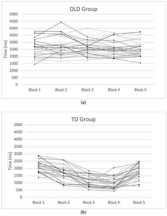 The results showed no significant main effects for either group or block. However, there was a notable interaction between group and block (F(4, 232) = 41.872, p < 0.001, η2partial = 0.419). This indicates that the DLD and TD groups exhibited different patterns of reaction time performance across the five blocks (Figure 2a,b). The observed power for this interaction was 1, suggesting a high likelihood of detecting significant effects. Independent sample t-tests indicated that the DLD group had significantly longer reaction times than the TD group in all blocks (block 1: t(58) = 2.974, p = 0.004; block 2: t(58) = 6.718, p < 0.001; block 3: t(58) = 12.838, p < 0.001; block 4: t(58) = 13.991, p < 0.001; block 5: t(58) = 5.712, p < 0.001).