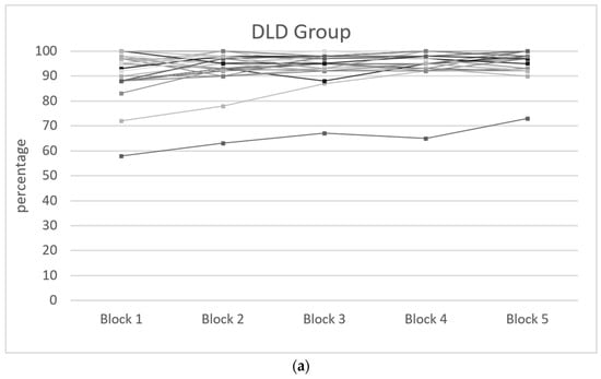 In the DLD group, a significant main effect for block was observed, indicating a progressive increase in accuracy performance across all blocks. However, there was no significant difference in accuracy between blocks 4 and 5, suggesting that the children became more efficient with the task but were not influenced by the serial pattern. This outcome is not well documented in previous studies [,,,], which mainly focus on the analysis of reaction times.