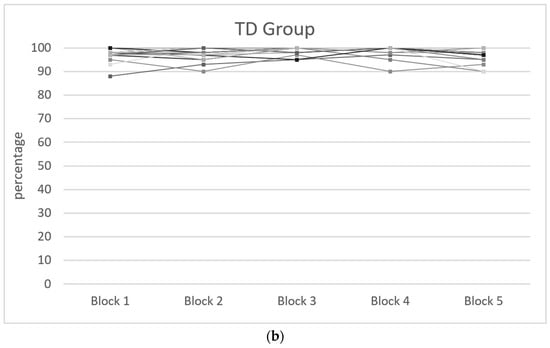In contrast, the TD group exhibited significant accuracy disparities across blocks, notably, a reduction between the final serial pattern block (block 4) and the random block (block 5). This drop in accuracy could be attributed to participants’ difficulty in adapting to the random presentation of stimuli, an occurrence anticipated within the SRT task framework of procedural memory [,,].