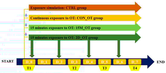 The exposure protocol to oxytocin and testing diagram. Fish were exposed to three different time frames for oxytocin: continuous (CON_OT group), fifteen minutes every day (15M_OT group), and fifteen minutes every two days (2D_OT group). Also, a control group was added (the CTRL group). The behavioral testing was scheduled for D_0, known to be the initial behavioral evaluation, and the third, fifth, and seventh days for compound effect quantification. D stands for day and T for testing.
