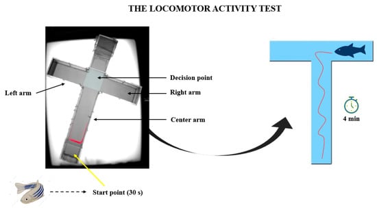 The locomotor activity test was assayed using the cross maze provided by Noldus Company that accompanied the EthoVision XT 11.5 software (Wageningen, Netherlands). The cross maze was transformed into a T-maze and divided into three arms as left, right, and center. A start point was established in the center arm, while the decision point was selected to be at the arms intersection (Figure 2). This test was performed in order to observe the changes that occurred in the zebrafish locomotion parameters. For this aim, several parameters were chosen, such as the total distance traveled, average swimming velocity, time spent inactive, clockwise and counter clockwise rotations, angular velocity, meander, and turn angle. Each trial consisted of a four minute recording that was further analyzed in real time through the behavioral software.