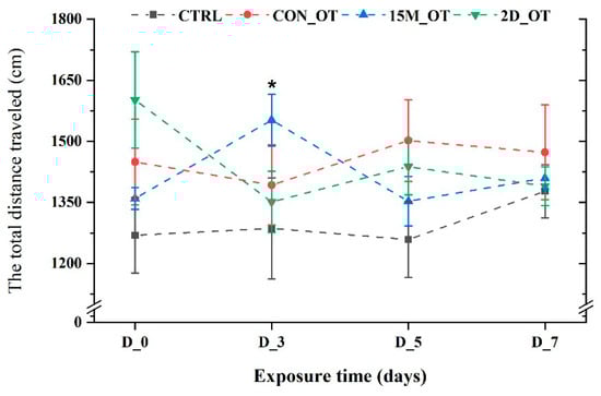 The total distance traveled by the experimental groups during the locomotor activity test. D stands for day and OT for oxytocin, gray line: control, red line: continuous exposure to OT (CON_OT), blue line: fifteen min exposure every day (15M_OT), green line: fifteen min exposure every two days (2D_OT). The data are expressed as mean ± SEM (n = 10); * p < 0.05 ANOVA, Tukey is significant compared to the results from D_0 that were set as the initial behavior of each experimental group.