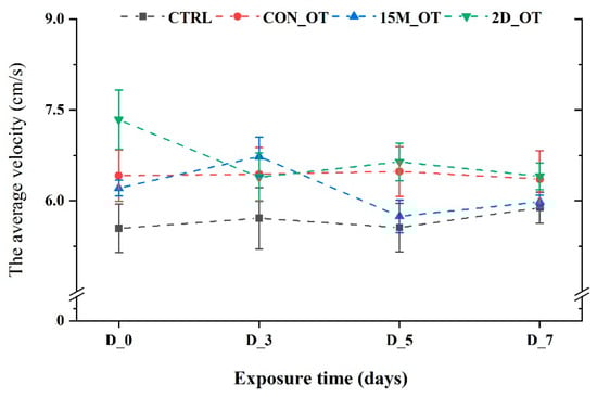 The first parameter measured for locomotor activity was the total distance traveled by the fish during the trials. There were no significant changes in this parameter values for CTRL and the group exposed continuously to OT (p = 0.31 and p = 0.19 ANOVA, Tukey’s test). In contrast, the group exposed to 15 min every day showed an increase in the distance traveled in the third day compared to the initial behavior (1552.2 ± 63.1 cm vs. 1359.7 ± 26.7 cm, p = 0.03 ANOVA, Tukey’s test) (Figure 4). While the fish exposed every day for fifteen min to OT returned to similar activity as that seen in the pretreatment stage, the fish that received the hormone every two days exhibited a decrease in the distance traveled: D_3 (1351.1 ± 75.1 cm), D_5 (1437.8 ± 69.2 cm), and D_7 (1390.1 ± 47.7 cm), compared to the initial data: 1601.8 ± 118.1 cm (p > 0.05 ANOVA). No significant changes were noted for the average velocity parameter of the zebrafish groups (p > 0.05 ANOVA) (Figure 5).