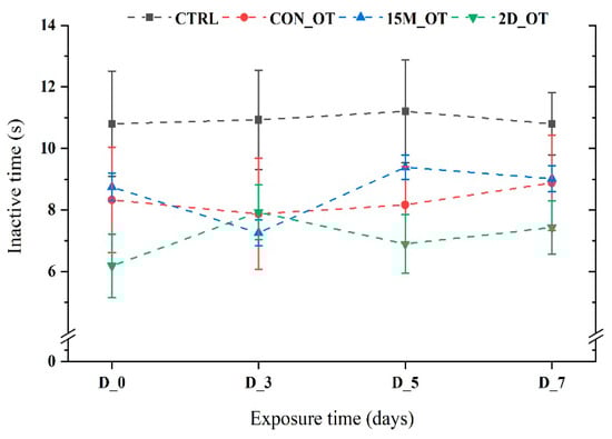 In regard to the time spent moving, the fish did not present any important modifications after exposure to OT (p > 0.05 ANOVA). As can be seen from Figure 6, the most inactive group was the control that simulated exposure to OT, while the OT groups exhibited different trends. For instance, 15 min of daily exposure led to a short time decrease in the inactivity time (7.2 ± 0.4 s, p = 0.07 ANOVA, Tukey’s test) when comparing the initial behavior (8.7 ± 0.4 s) with the other two testing days: D_5: 9.3 ± 0.3 s (p = 0.005 ANOVA, Tukey’s test) and D_7: 9 ± 0.4 s (p = 0.02 ANOVA, Tukey’s test). On the other hand, the last group that received OT every two days did not display any significant effect of the compound, being less inactive for the majority of time except for D_3 (7.9 ± 0.8 s, p = 0.56 ANOVA, Tukey’s test) vs. initial behavior (6.1 ± 1.03 s) (Figure 6).