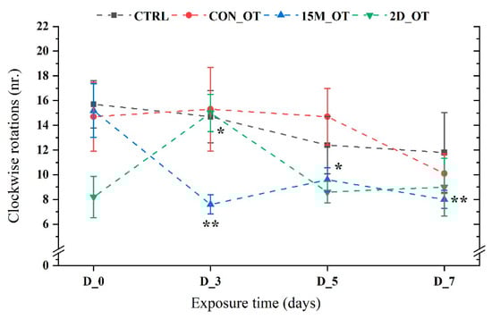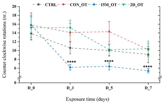 Clockwise rotations (right-hand) were generally similar to the initial behavior for the control fish and for the group exposed continuously to OT (p = 0.57, respectively, p = 0.86 ANOVA). Although no important effects were observed for the CON_OT group, 15M_OT exhibited a lower number of rotations in all the experimental days (D_3: 7.6 ± 0.7, p = 0.001 ANOVA, Tukey’s test; D_5: 9.6 ± 0.9, p = 0.02 ANOVA, Tukey’s test; D_7: 8 ± 0.7 p = 0.002 ANOVA, Tukey’s test), when compared to the initial behavior (15.2 ± 2.1) (Figure 7). Regarding the last group rotations, this parameter recorded a significant value for D_3 (15 ± 1.5, p = 0.03 ANOVA, Tukey’s test) vs. CTRL (8.2 ± 1.6), with no more changes until the end of the study.